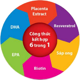 Dầu cá tinh chế (chứa EPA) 228.67mg, Chiết xuất nhau thai heo 144mg, chiết xuất vỏ quả nho (chứa 10mg resveratrol) 15mg, vitamin B2 0.22mg, vitamin B1 0.2mg, vitamin B2 0.22mg, vitamin B6 0.2mg, biotin 9mg