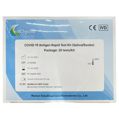 Easy Diagnosis Covid-19 Antigen Rapid Test Kit là Kit test nhanh sử dụng mẫu nước bọt do Wuhan EasyDiagnosis Biomedicine sản xuất theo công nghệ Đức. Thiết bị này được thiết kế nhỏ gọn, dễ sử dụng, cho kết quả nhanh chỉ trong vòng 15 phút. Đây là bộ phát hiện kháng nguyên Covid-19 được Bộ Y Tế cấp phép sử dụng rộng rãi trên toàn quốc.