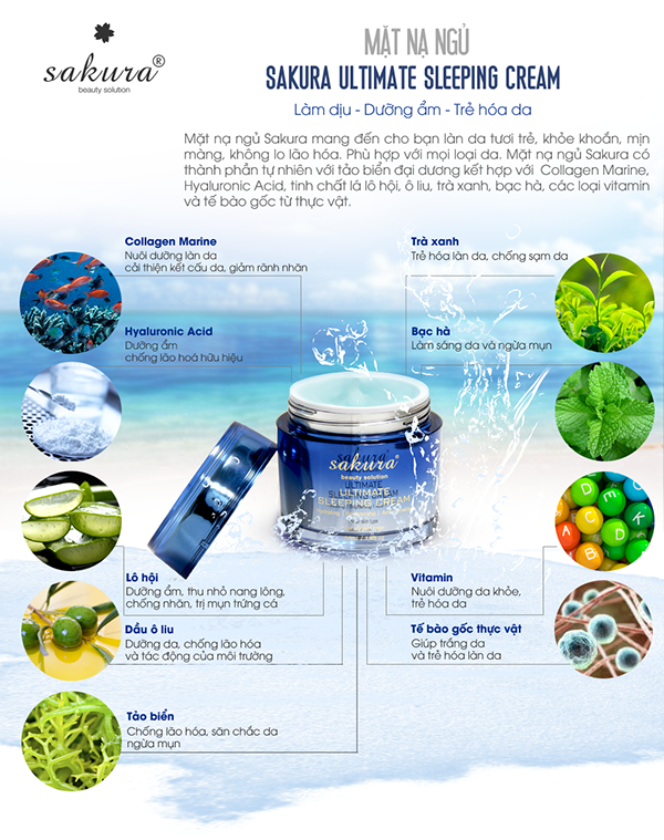 - Với phức hợp đột phá các thành phần có trong Sakura Ultimate Sleeping Cream gồm các hoạt chất cao cấp từ thiên nhiên dạng Gel mát lạnh giúp cung cấp nước, làm sáng và chống lão hoá chỉ sau 1 đêm sử dụng.