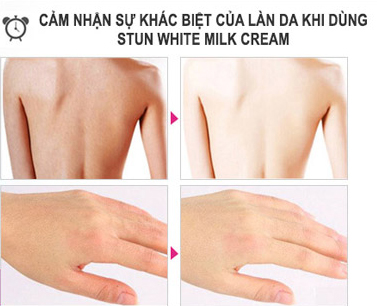 - Stun White Milk Cream giúp làm trắng da hiệu quả, kích thích tái tạo tế bào mới thúc đẩy và nuôi dưỡng da trắng dần, làm chậm quá trình lão hóa da.