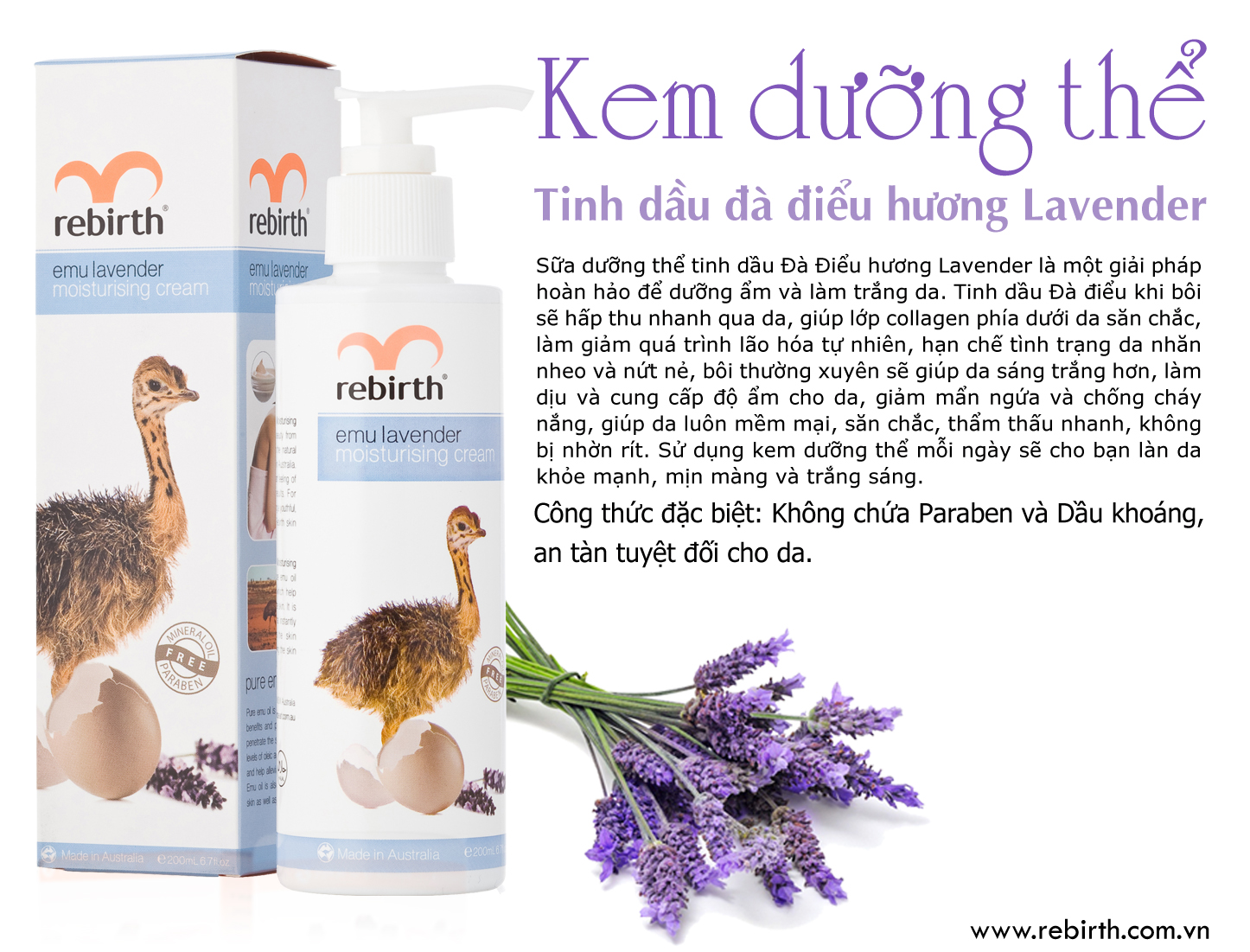 Sữa dưỡng thể làm trắng da rất giàu tinh dầu Đà Điểu và tinh dầu Lavender giúp dưỡng ẩm làm mềm mịn và trẻ hoá da, không gây nhờn rít. Cho làn da trắng sáng, mịn màng và tràn đầy sức sống.