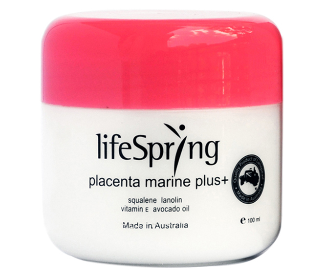 Placenta Marine Plus+ bao chứa hợp chất đặc biệt bao gồm chiết xuất nhau thai, chất hydro không bão hòa, lanolin, dầu quả bơ và vitamin E. Sản phẩm giúp làm giảm nếp nhăn, và duy trì dáng vẻ mềm mại cho làn da, làm mờ phần nào vết đen trên da.