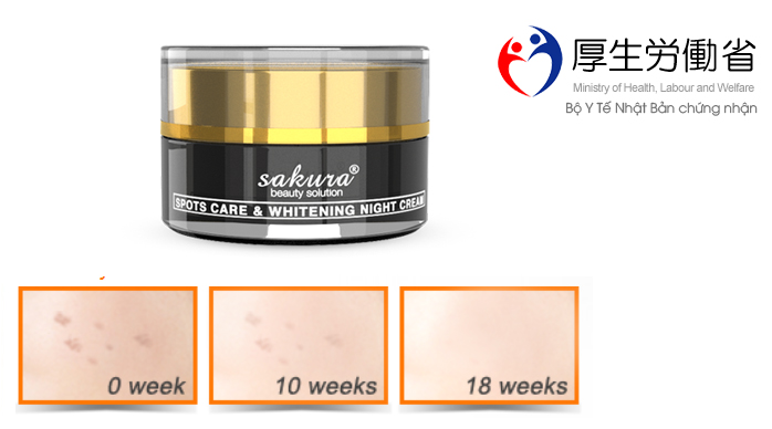 Kem dưỡng trị nám ban đêm Sakura Spot Care & Whitening Night Cream là giải pháp vượt trội giúp bạn có được làn da sáng hồng, mịn màng trong thời gian ngắn, sản phẩm thích hợp cho mọi đối tượng, ngay cả những người có làn da mỏng, nhạy cảm. Với công thức làm trắng da, giảm nám, tàn nhang theo công nghệ hàng đầu của Nhật, sản phẩm đã được bộ Y Tế Nhật Bản chứng nhận với thành phần hoạt chất Tranexamic acid (được giới chuyên môn đánh giá cao trong việc điều trị nám da) cung cấp dưỡng chất thẩm thấu sâu vào hạ bì da, giúp giảm đốm nâu, tàn nhang, đồi mồi, trị nám, làm mờ vùng da sạm màu, phục hồi da hư tổn mà không hề làm da mỏng đi và không gây thiệt hại gì cho da.