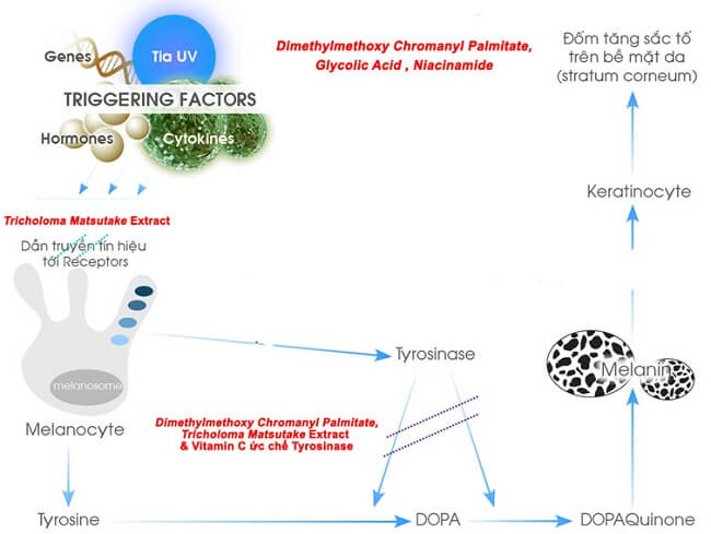 - L-Ascorbic Acid: Làm sáng da, mờ thâm nám thông qua cơ chế giảm phản ứng từ dopaquinone -> dopa, ức chế peroxidases, đồng thời hỗ trợ kích thích tổng hợp Collagen, tái tạo cấu trúc da săn chắc.