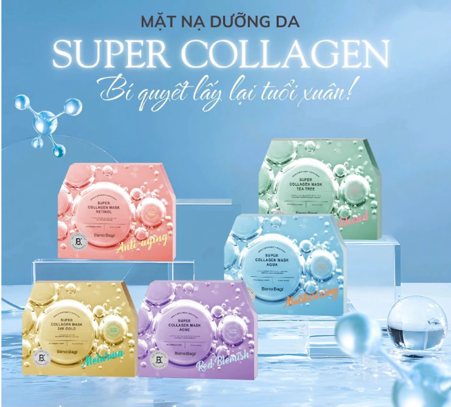 - Mặt nạ Banobagi Super Collagen Mask với công thức chứa hàm lượng cao Collagen hoà tan và Hyaluronic Acid, kết hợp cùng các loại vitamin giúp cung cấp ẩm, làm sáng và nuôi dưỡng làn luôn da căng mịn, ngăn ngừa lão hóa, tràn đầy sức sống.