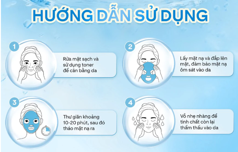 - Lấy mặt nạ đắp vừa khít với khuôn mặt. Sau 15 - 20 phút, gỡ mặt nạ ra và massage nhẹ nhàng tinh chất còn trên da để hấp thụ hoàn toàn