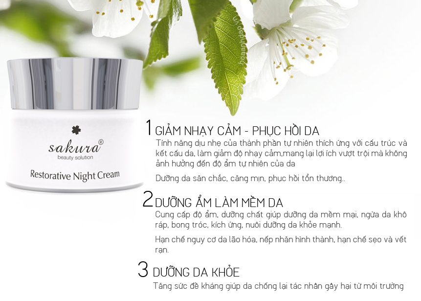 Sakura Restorative Night Cream chính là một trong những bí quyết mang đến cho bạn một liệu trình phục hồi da an toàn bậc nhất, hiệu quả vượt trội để “tái sinh” làn da dang bị tổn thương, giúp da khỏe mạnh, tươi trẻ.