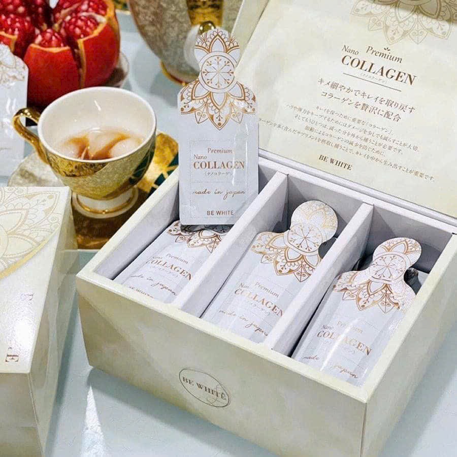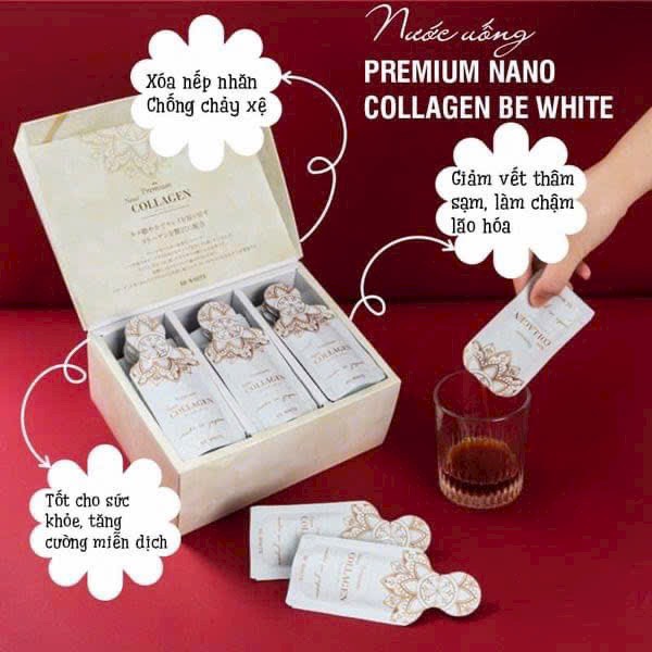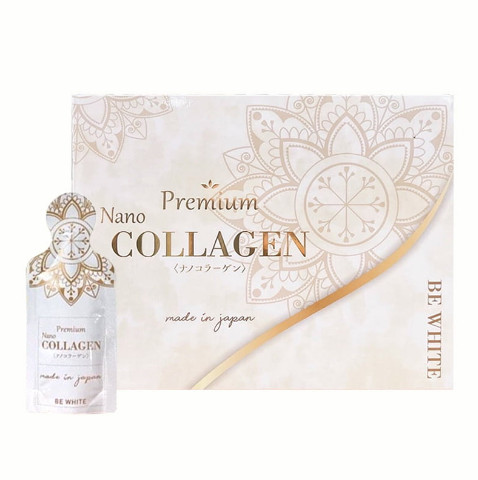 Collagen Nano Be White là dòng nước uống bổ sung collagen cao cấp của Nhật Bản. Nước uống có thành phần chính là nano collagen hàm lượng lên đến 50.000mg, cùng với chiết xuất tổ yến, vitamin C, nước ép dứa, giúp làm đẹp da, nâng cơ, xóa nhăn, làm trắng da, trì hoãn quá trình lão hóa. Công thức nano collagen phân tử siêu nhỏ, hấp thu nhanh chóng và hiệu quả cao. Bên cạnh đó, các dưỡng chất từ thiên nhiên, vitamin rất tốt cho sức khỏe, hoàn toàn không gây tác dụng phụ.