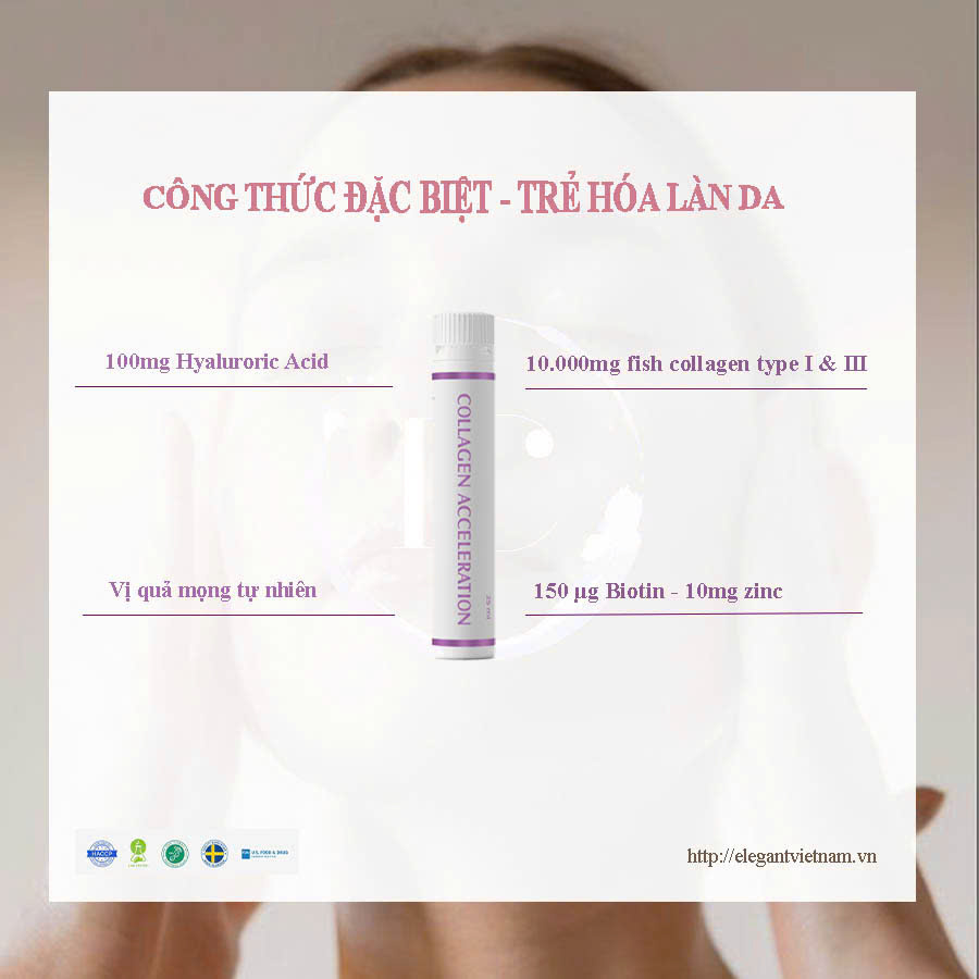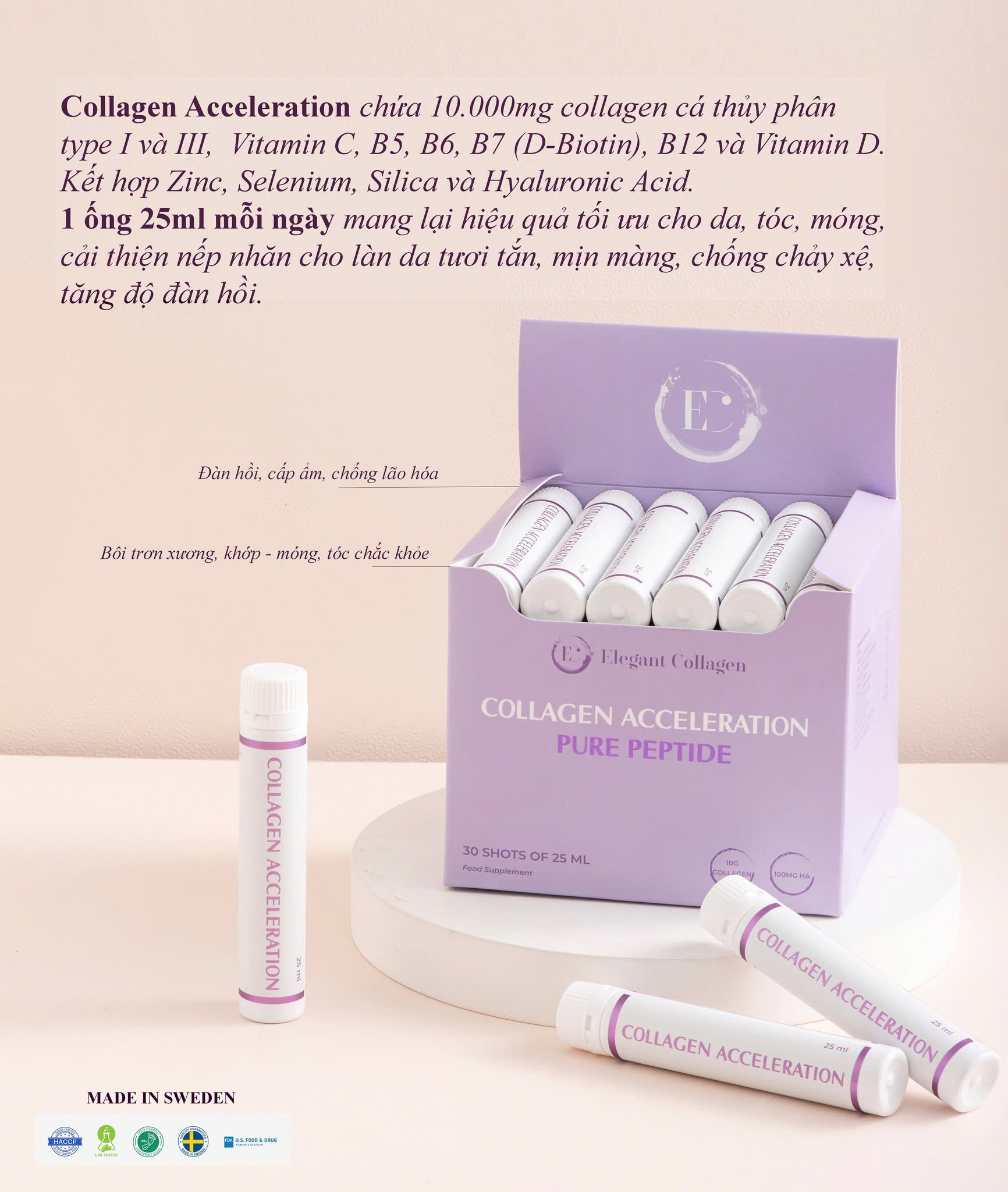 - Bổ sung Collagen Acceleration Pure Peptide Elegant Thuỵ Điển 8 tuần làm tăng đáng kể quá trình hydrat hóa da và sản xuất collagen. Các nếp nhăn được cải thiện rõ rệt và da lấy lại độ đàn hồi vốn có của nó.