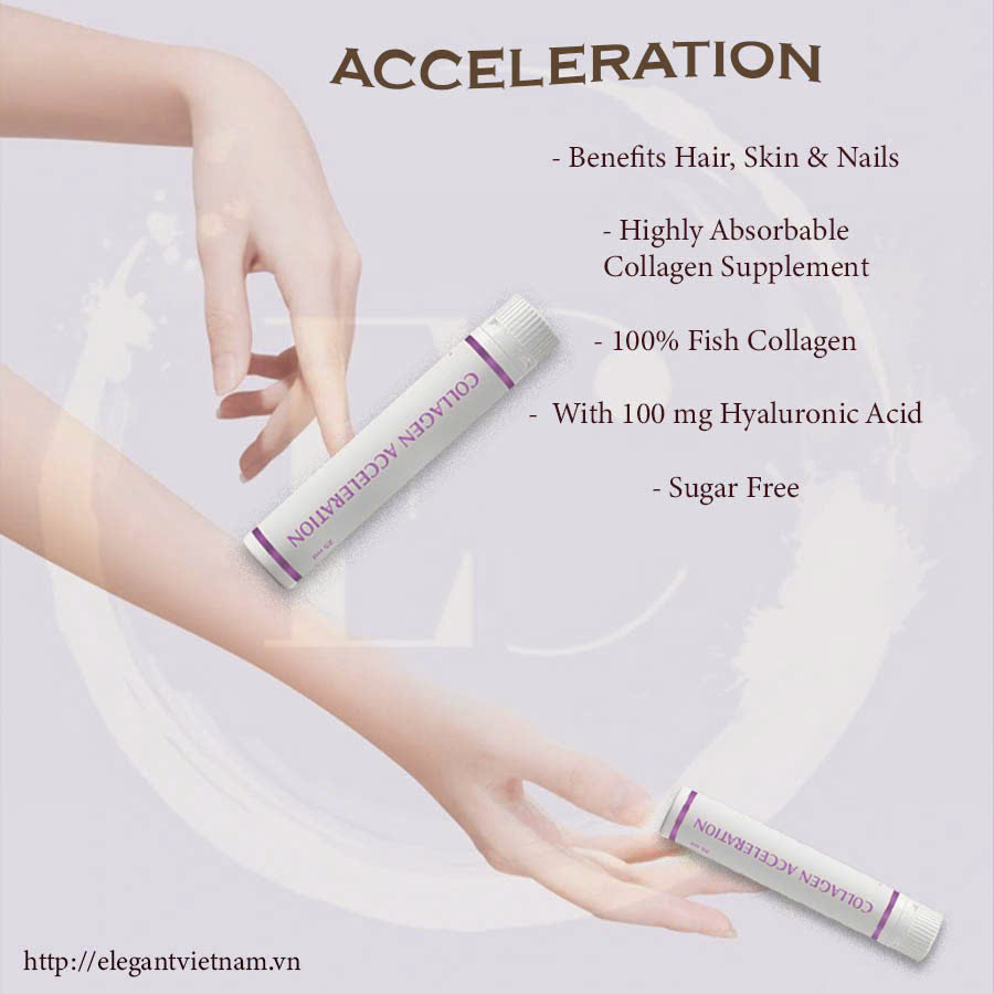 Bạn sẽ không bao giờ quên uống collagen nữa với Collagen Acceleration, dạng đóng gói ống 25ml dễ dàng mang theo bên mình mọi lúc mọi nơi. Collagen Acceleration là sự lựa chọn hoàn hảo cho những người bận rộn, luôn phải di chuyển. Liều dùng hàng ngày chứa hàm lượng collagen biển thủy phân cao nhất, 10.000 mg mỗi liều, cộng với các hoạt chất chống lão hóa như axit hyaluronic và vitamin C chống oxy hóa giúp chống lại và đẩy lùi các dấu hiệu lão hóa cũng như cải thiện kết cấu của tóc và móng tay. Collagen Acceleration được phát triển để: