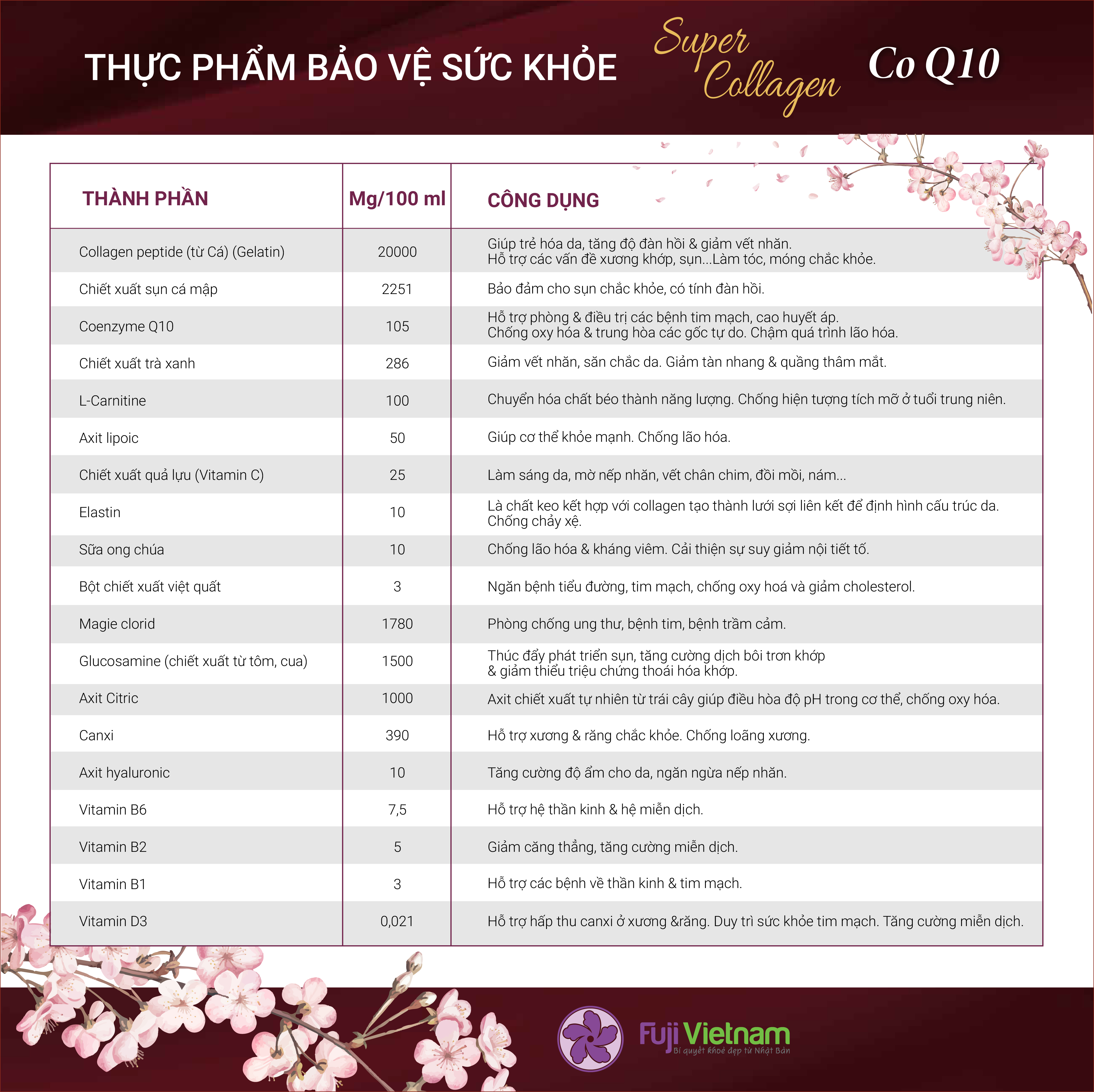 Fish collagen, vitamin C, chondroitin salfate, lactic axit calcium, Co-Q10, L-canitine, elastin, axit citric, royal jelly, vitamin B6, vitamin B1, fruite sugar, glucosamine, blueberry flavor, magnesium chloride, axit alpha-lipoic, catechin, axit hyaluronic, benzenecaboxylica sodium axit, vitamin E, vitamin B2, vitamin D3.