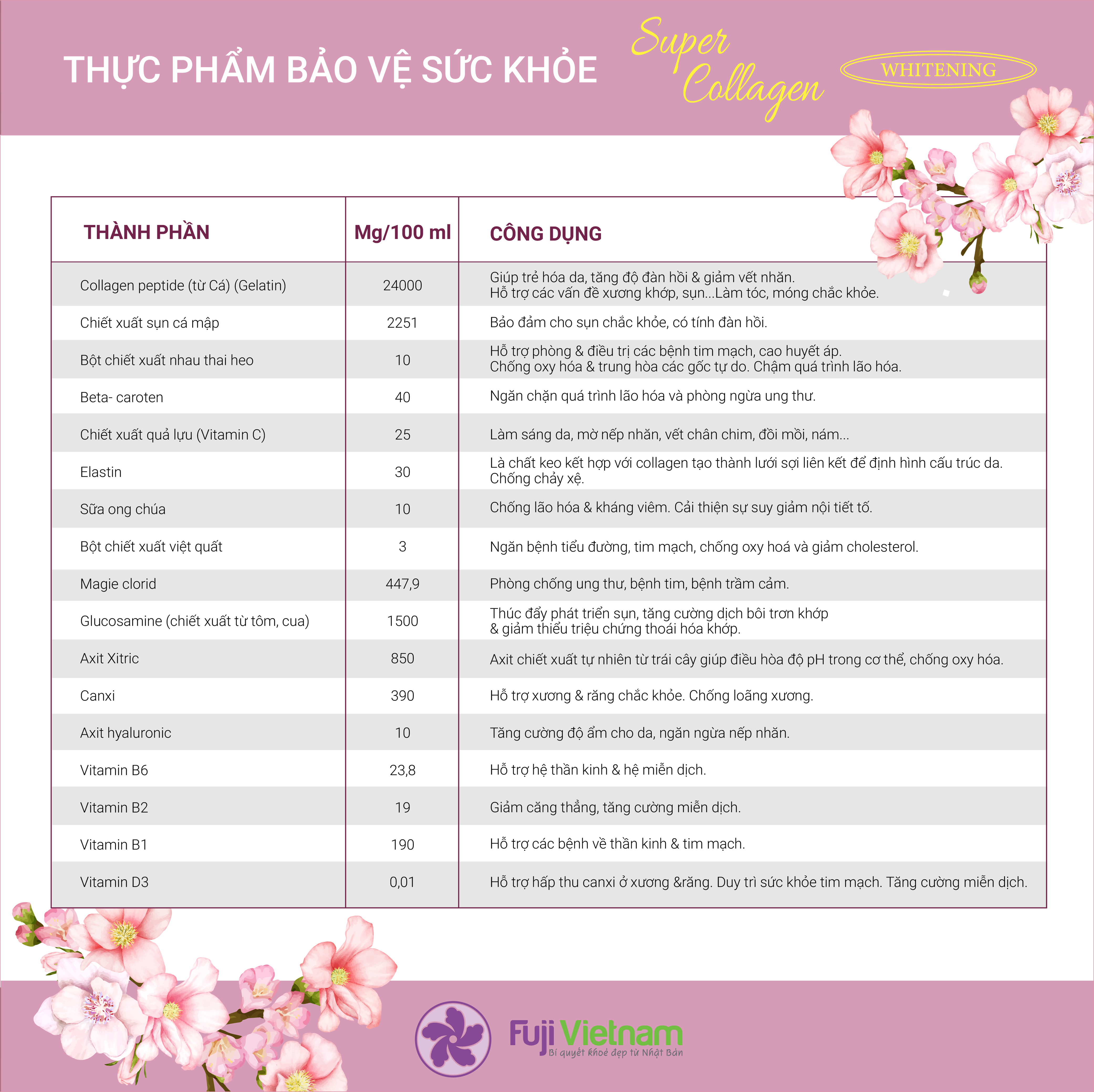 Super Collagen Nhật Bản chiết xuất từ tự nhiên từ sụn và da cá biển, được bào chế ở dạng tinh chất đậm đặc với hàm lượng collagen cao nhất hiện nay đạt đến 24gram trong 10ml. Đây là sản phẩm được sản xuất trên dây chuyền công nghệ hiện đại bậc nhất của Tập đoàn Fuji Health – Nhật Bản, được Cục Dược phẩm và Thực phẩm Hoa Kỳ (FDA) chứng nhận là thực phẩm an toàn, không gây nên tác dụng kể cả đối với phụ nữ mang thai và cho con bú. Super Collagen Nhật Bản bổ sung hàm lượng collagen cần thiết giúp tăng cường độ đàn hồi cho da, cải thiện các nếp nhăn đồng thời thúc đẩy sản sinh tế bào mới làm nhanh lành những tổn thương trên da. Bên cạnh đó, Super Collagen Nhật Bản còn là phương pháp chăm sóc sức khỏe hữu hiệu, giúp tăng cường sức đề kháng cho cơ thể, bảo vệ hệ mạch máu khỏe mạnh, duy trì tính linh hoạt của hệ xương khớp và góp phần nuôi dưỡng tóc, móng khỏe đẹp.