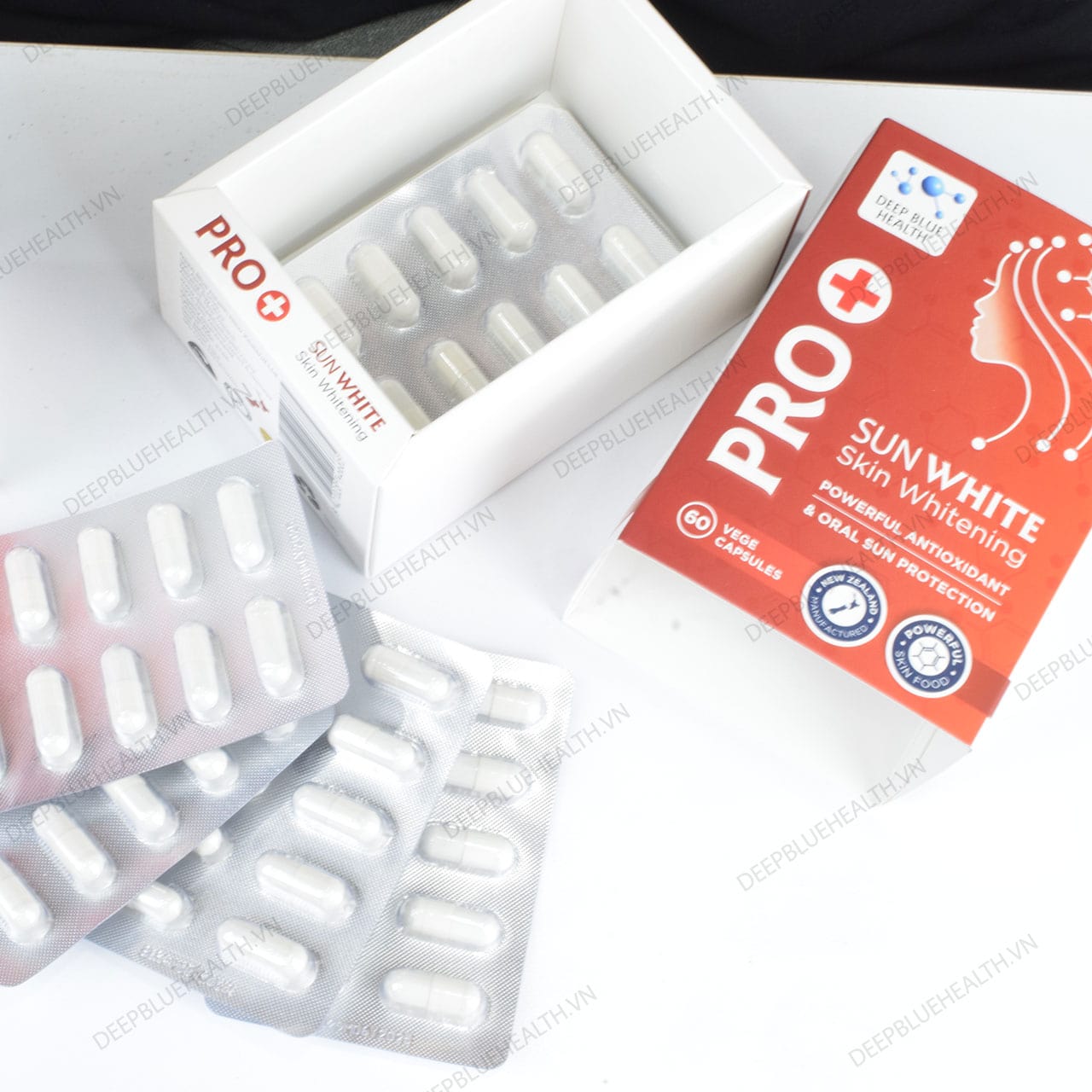 Mỗi viên nang Deep Blue Health Pro Sunwhite chứa: L-Glutathione 250mg, Beta Carotene 2.5mg (1 dạng Vitamin A từ thực vật), Chiết xuất lá trà xanh (Green Tea Leaf Extract) 25mg / Equiv, Lá trà xanh khô 300mg / Equiv, Catechin 7,5mg, Chiết xuất rễ dương xỉ Calagula Root Extract 240mg / Equiv, rễ dương xỉ khô Calagula Root Dry 2400mg (2,4g), Chiết xuất hạt lựu (Pomegranate Seed) 25mg / Equiv, hạt lựu khô 375mg và vật liệu hỗ trợ đóng gói. Pro Sunwhite không chứa: Gluten, trứng, sữa, đậu nành, lúa mì, men, hương vị nhân tạo, chất ngọt hoặc màu sắc.