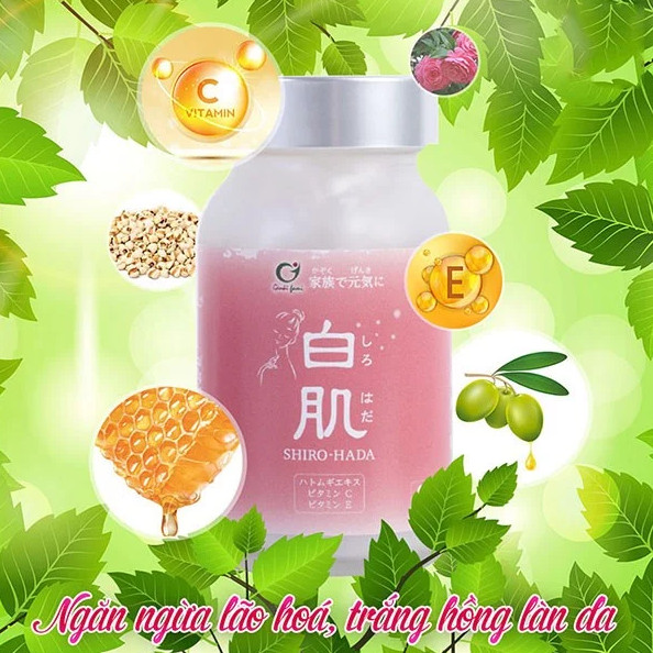 Shirohada viên uống trắng da, cải thiện lão hóa da với thành phần hoàn toàn thiên nhiên như: Hatomugi ( Hạt ý dĩ), Tsubaki ( Hoa trà đỏ), Dầu olive nguyên chất, Vitamin E, C, đã được phụ nữ Nhật Bản sử dụng để dưỡng da giúp da trắng sáng, mịn màng từ xa xưa.