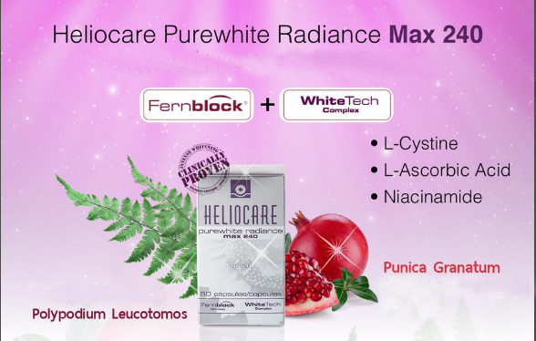 Tất cả dưỡng chất của trong viên uống trắng da, chống lão hóa Heliocare Purewhite Radiance Max 240 hoạt động theo công nghệ chống nắng mới của Heliocare, nhằm kiểm soát và khóa enzym tăng động, ức chế sản sinh melanin, nguyên nhân gây nám da, đồng thời tái cấu trúc da mới với vẻ trắng sáng, mịn màng hơn.