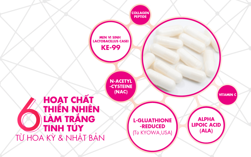 Ngoài ra, sản phẩm còn chứa 6 hoạt chất làm trắng, giúp nuôi dưỡng da khoẻ mạnh. Đây đều là những tinh tuý thiên nhiên từ Mỹ, Nhật Bản, cho phép: