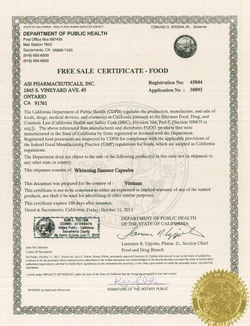 Giấy chứng nhận về sản phẩm Viên Uống Trắng Da Primo Whitening Essence