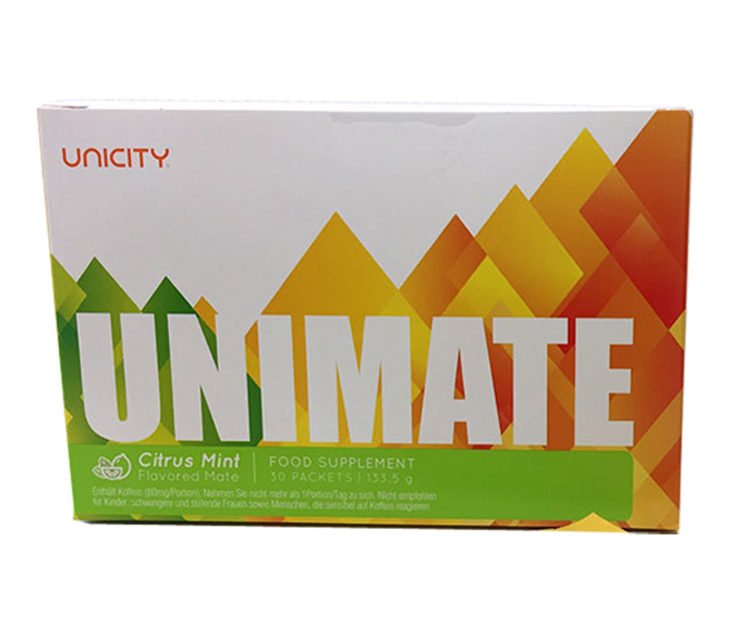 Unimate Unicity hay còn gọi là trà Unimate Unicity, sản phẩm được đóng gói chiết xuất dưới dạng bột, được chế biến từ nguồn nguyên liệu thảo dược thiên nhiên đạt chứng nhận bởi tiêu chuẩn quốc tế. Sản phẩm phù hợp với những người vận động nhiều, hay tập luyện thể thao cần dung nạp năng lượng, giúp giảm mệt mỏi và uể oải, căng thẳng, stress ở người làm việc trí óc, giúp tăng khả năng tập trung, tăng sức chịu dựng, tăng sự tỉnh táo, tăng cường trí nhớ, giảm stress, bổ sung dinh dưỡng cho não.