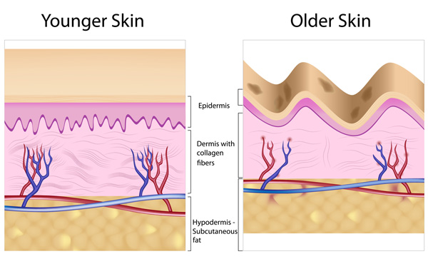 Điều này biểu hiện ra bên ngoài (từ tuổi 30 trở đi) là da không còn rạng rỡ mà khô, nhăn và chảy sệ. Các nếp nhăn bắt đầu xuất hiện nhất là vùng mắt, vùng cổ, khóe miệng, vòm trán, tay, gót chân, lỗ chân lông nở rộng, mí mắt sụp, mông, ngực chảy xệ không còn đầy đặn và săn chắc... Sau tuổi 40 lượng Collagen chỉ còn 70% so với lúc tuổi 20.