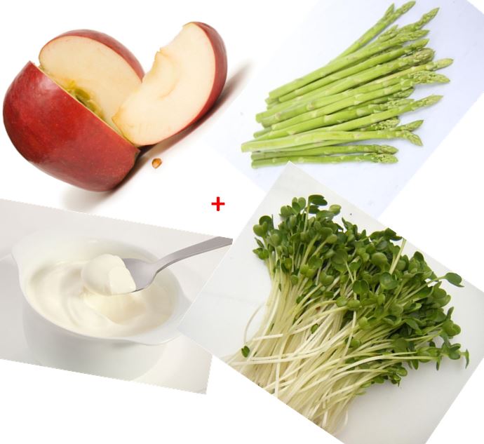 Nguyên liệu: 1 quả táo, 3 cây măng tây, 1 hộp sữa chua, rau mầm