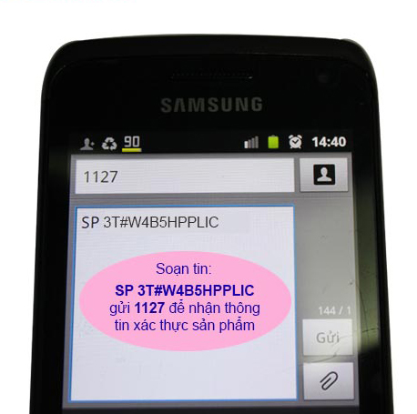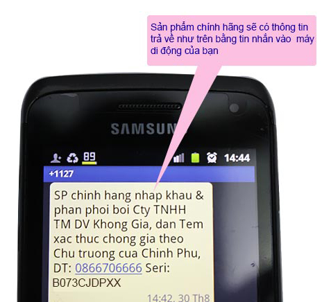 - 01tem của ban chỉ đạo trung ương 127, khi cào lớp tem này ra và soạn tin nhắn theo cú pháp ghi trên tem sẽ nhận được tin trả về từ tổng đài tin nhắn 1127 với nội dung: "SP chinh hang nhap khau & phan phoi boi CTy TNHH TM DV Khong Gia, dan tem xac thuc chong gia theo Chu truong cua Chinh Phu, DT: 0866706666 Seri: xxx ( xxx: trùng với seri trên tem)". Như hình dưới: